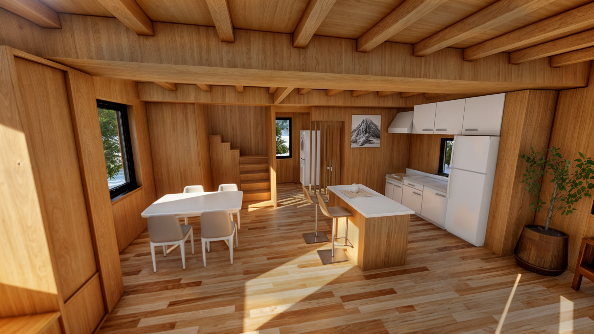 The modern kitchen is thoughtfully designed with high-quality finishes, providing both style and practicality for everyday use. Adjacent to the living area, a full bathroom adds convenience, perfect for both residents and guests. A beautifully crafted staircase leads to the private quarters on the upper level, blending seamlessly into the space.