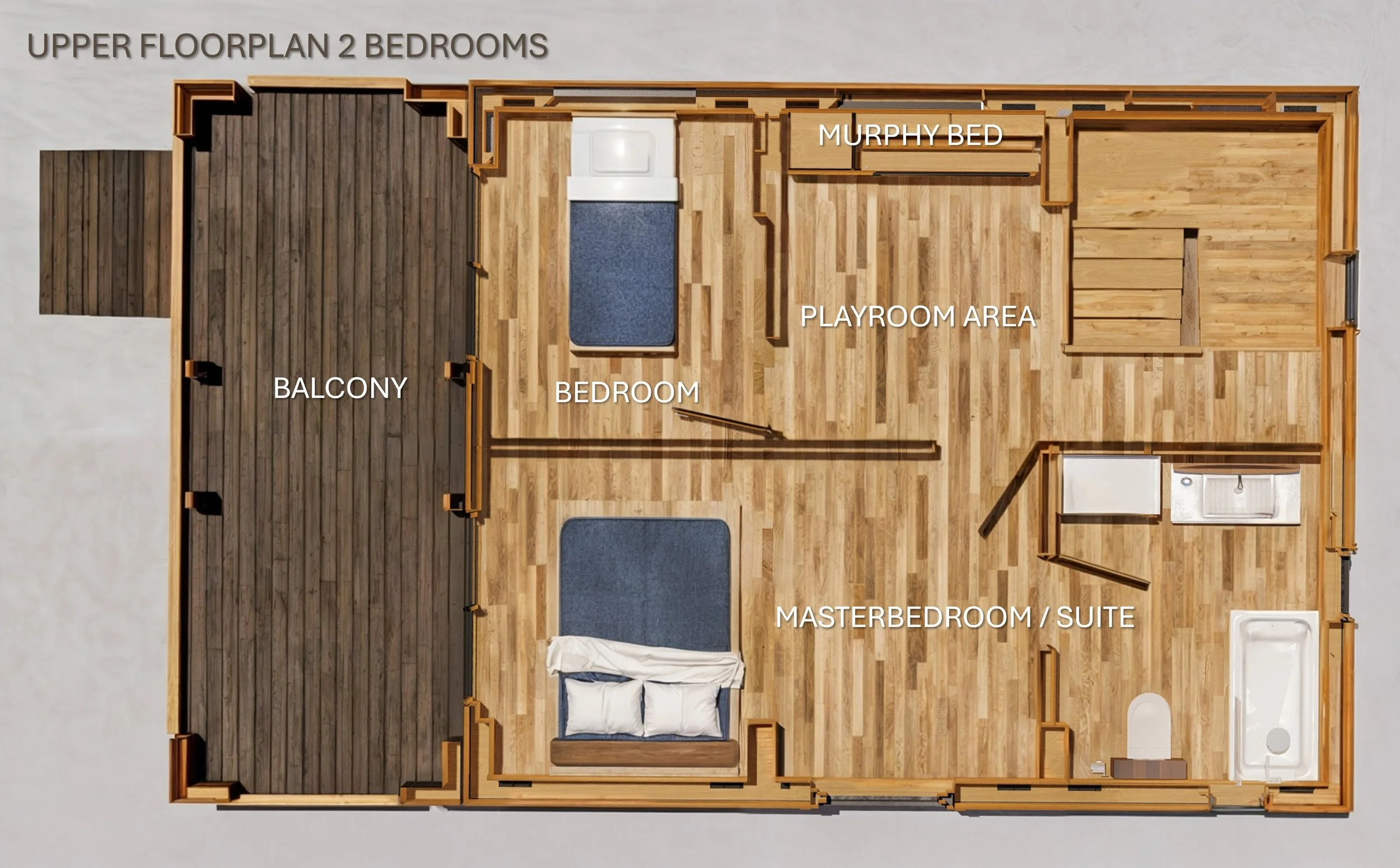 Adding to the versatility of the upper floor, a dedicated playroom offers a flexible area for relaxation or entertainment. Designed for both leisure and practicality, it includes a Murphy bed, seamlessly transforming the space into an additional sleeping area when needed.